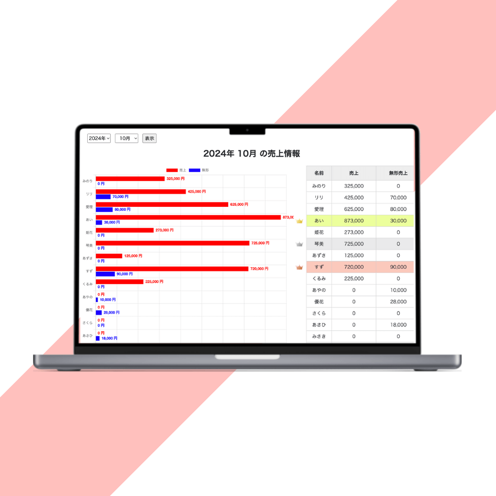 売上を入力するだけで店舗の月額売上や従業員別の売上を自動的に計算します。